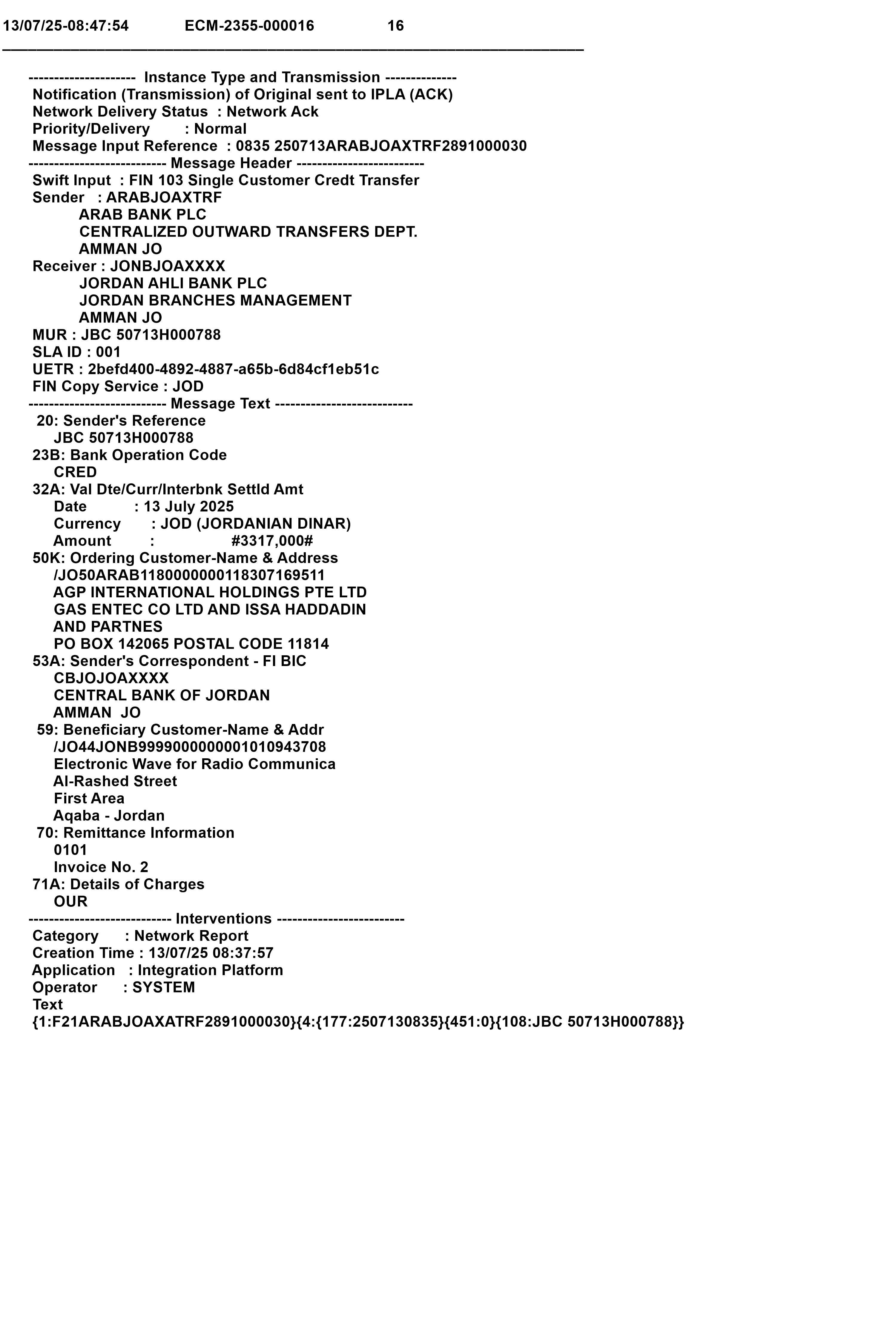 JOD - Arab Bank Acc # 0118/307169-3/501