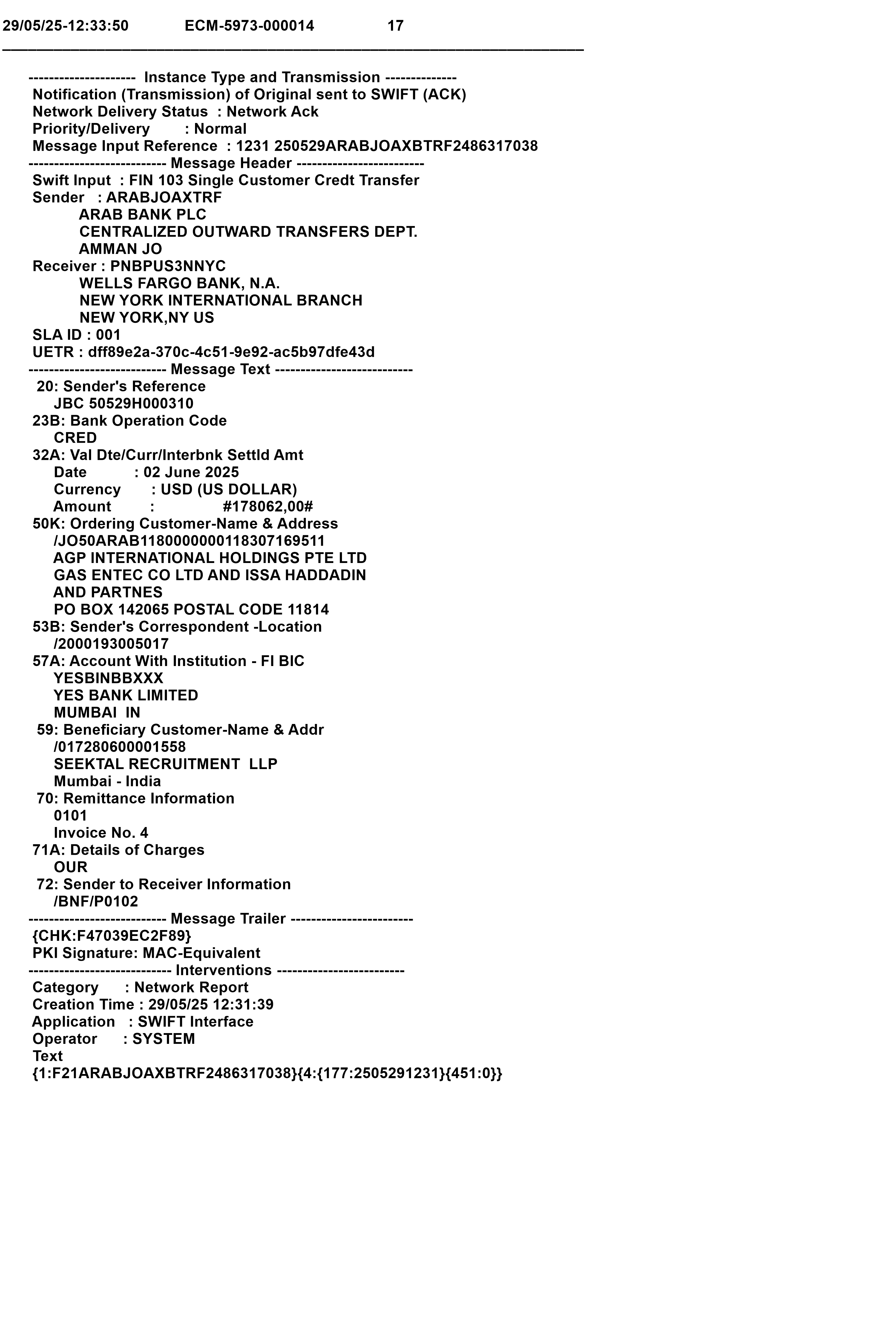 USD - Arab Bank Acc # 0118/307169-3/510